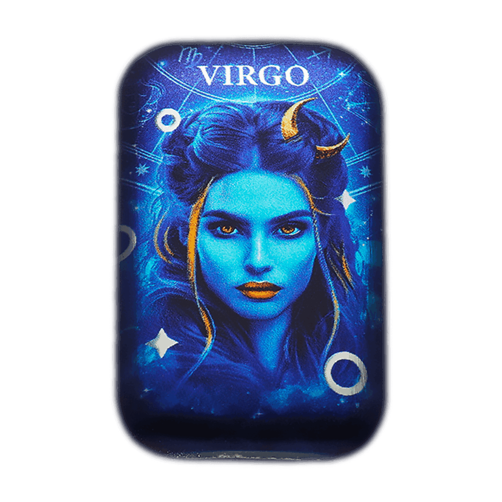 La superficie del lingotto presenta la figura iconica della Vergine, immersa in una palette di blu cosmico e impreziosita da dettagli stellari che conferiscono profondità e luminosità alla composizione. I tratti delicati e al tempo stesso decisi evocano l’essenza del segno: un’intelligenza attenta, una bellezza composta e uno sguardo che riflette equilibrio e una profonda saggezza interiore.