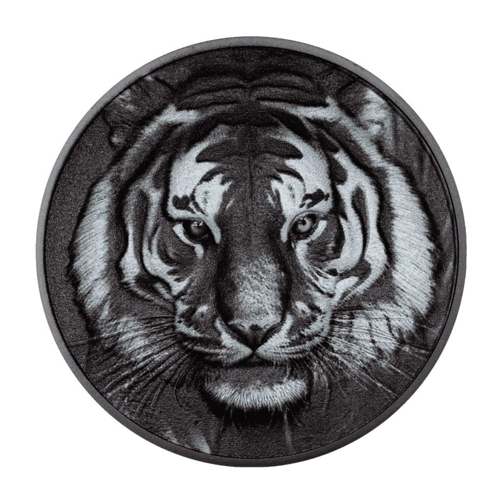 This powerful coin celebrates the tiger, a universal symbol of strength, courage, and untamed independence. Its obsidian black finish sets the stage for a stunningly precise portrait of the majestic feline. White accents trace the iconic stripes, while the tiger's intense, reflective eyes draw the viewer into a primal gaze. A textured background mimicking fur adds depth and tactile appeal, connecting this masterpiece to the wild it represents. A captivating tribute to one of nature’s most revered predators.